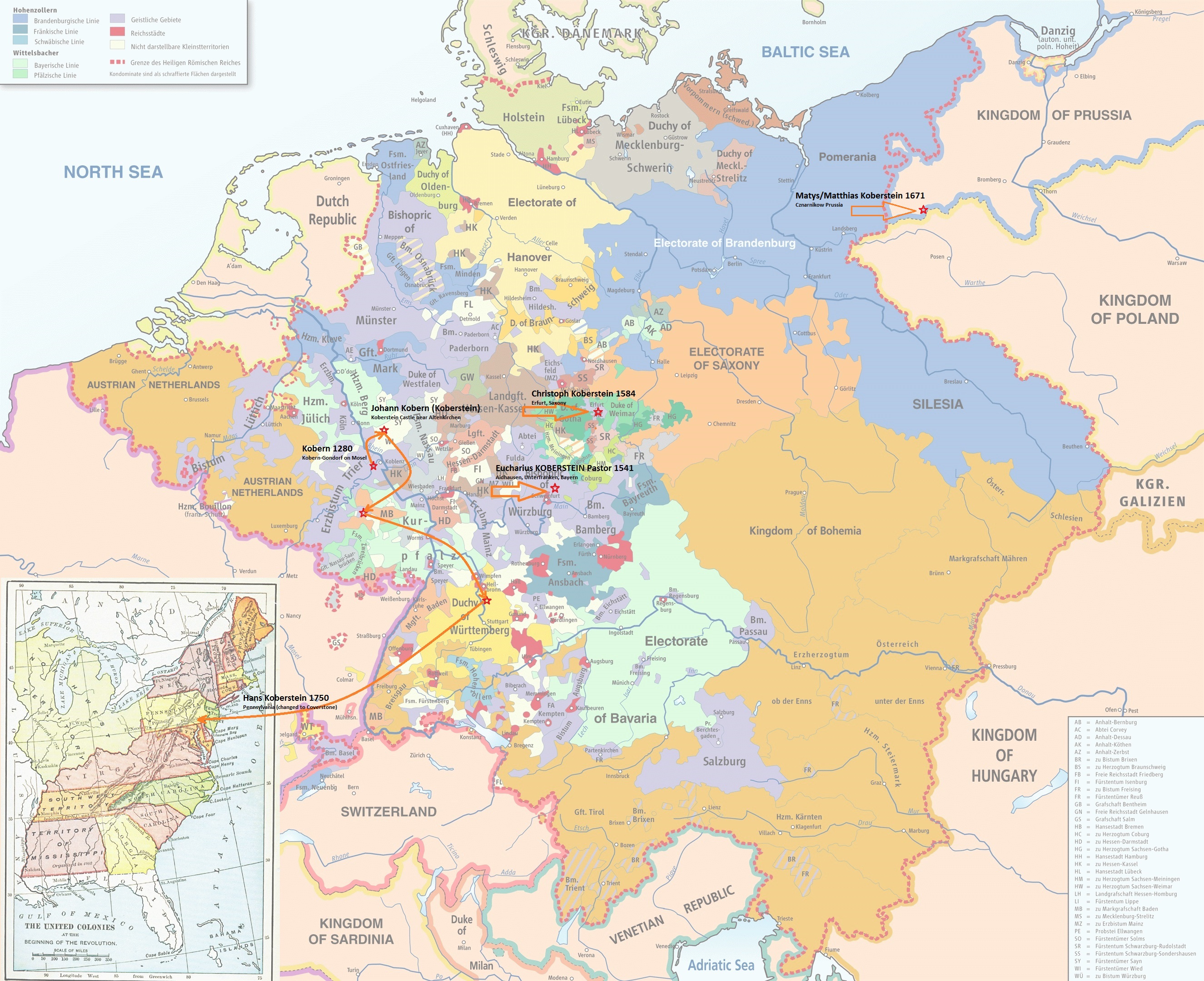 Map of Koberstein Locations Names that have Koberstein families are in red and clickable. You will go to the next level of maps and end up in the family tree. Only root individuals of each known line are shown. For instances under Matys there is a lot of data but only Matys and in shown on the Poland map. Press back arrow on your browser to return to previous map.Koberstein Diaspora Maps: Early (13-17th Century), and Late (18-19th Century, old version) |