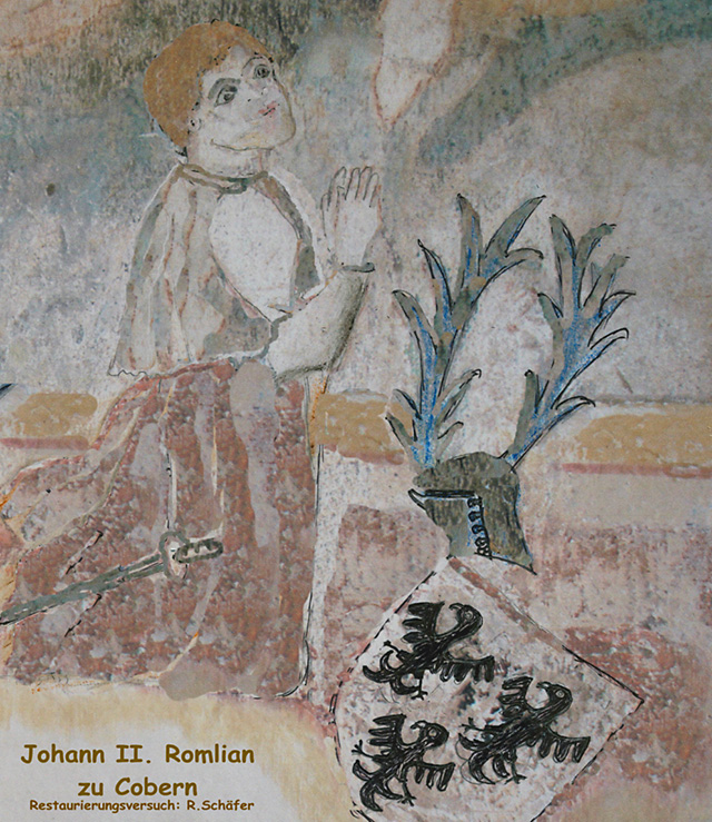 Johann Rumlian Von Covern has this picture. The events of his life recorded below indicat him to be the Ritter (Knight) kurtrierscher Rat Johann Romilian Von Cobern (1375-1420) married to Agnes Von Langenau (1361-1438).