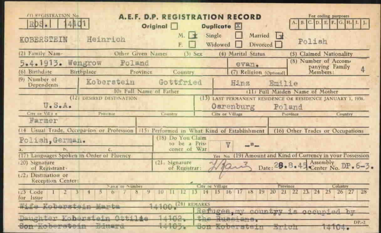 | KOBERSTEIN | Heinrich | Węgrów, Poland | 04/05/1913 | " | ||