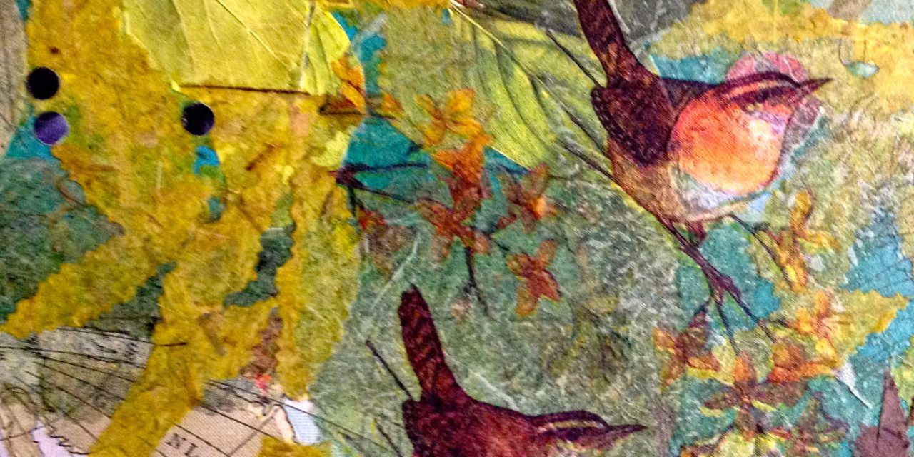 DOWNTOWN EUGENE’S FIRST FRIDAY ARTWALK OF SPRING HAS A DECIDEDLY SEASONAL FEEL This is a paper collage artwork Birds against foilage.