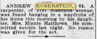 2. Andrew KOBERSTEIN (Anthony ) was born in 1847 in Brooklyn, New York City, New York, United States. He died on 13 Dec 1915 in Brooklyn, Kings, New York, United States. |