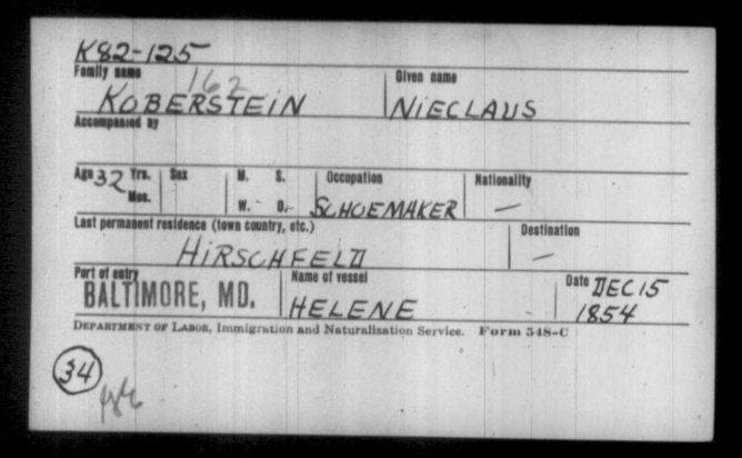 | Niclaus Koberstein (2) | - | - | Male | Shoemaker | Bremen, Germany | Hirschfeld | Helene |