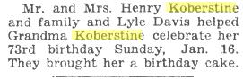 This January 28, 1955 newspaper article indicates that Henry Koberstine among others celebrated Grandma Koberstine's 73rd birthday, which was Sunday January 16th. This means that Grandma Koberstine was born January 16, 1882. So this would be Grandma Almeda Anna Koberstine nee Lynch