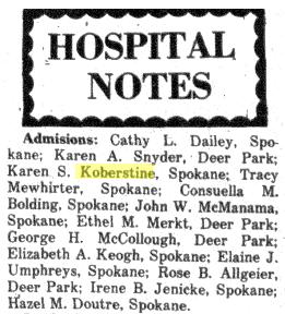 Now we jump all the way to February 14, 1974 and back in Deer Park we note that Karen S. Koberstein was admitted into the hospital.