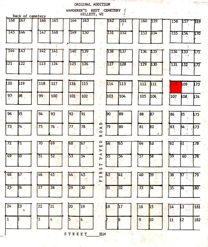 Wanderer's Rest Cemetery is in Gillett township in the southwest quadrant of the city of Gillett on South Elm Street as per the map given on the Oconto County WiGenWeb Site. Sexton - City Hall, Gillett City Clerk Gillett, WI 54124 855-2089