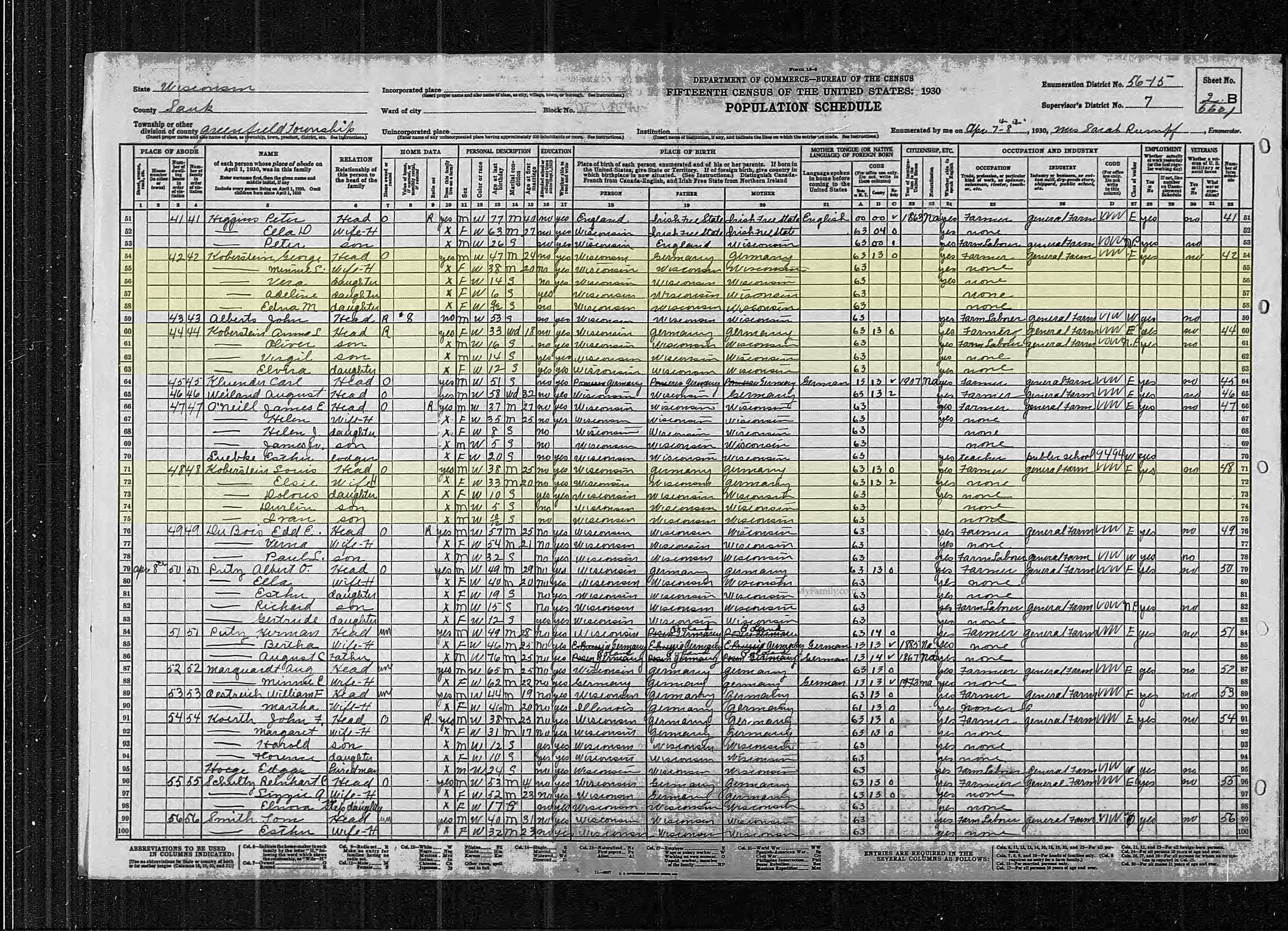 Geroge, Minnie, Vera, Adeline, and Edna are listed on lines 54-58.
