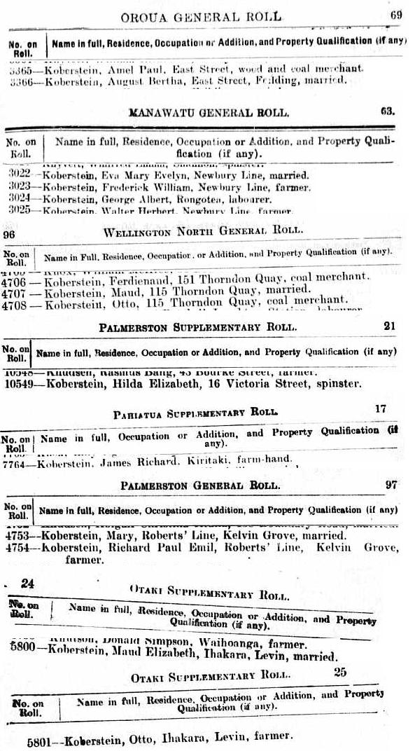 All New Zealand, Electoral Rolls, 1919 results for Koberstein