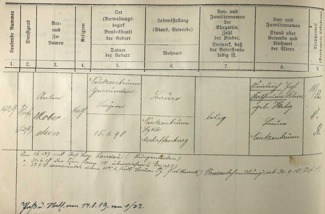 Name: Anton Koberstein Birth Date: 15 Jan 1898 Birth Place: Neutzenbrunn Gemünden Bayern (Bavaria) Combat Arm: Infanterie Type of Unit: Infanterie-Regimenter Unit: 32. bayer. Infanterie-Regiment Volume: 2326. Kriegstammrolle: Bd. 2