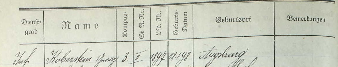 Name: Franz Koberstein Birth Date: 18 Jan 1898 Birth Place: Augsburg Combat Arm: Infanterie Type of Unit: Infanterie-Regimenter Unit: 3. bayer. Infanterie-Regiment Volume: 609. Gesamt-Renner: 1. - 4. Kompanie und 1. Masch.-G.-Komp.
