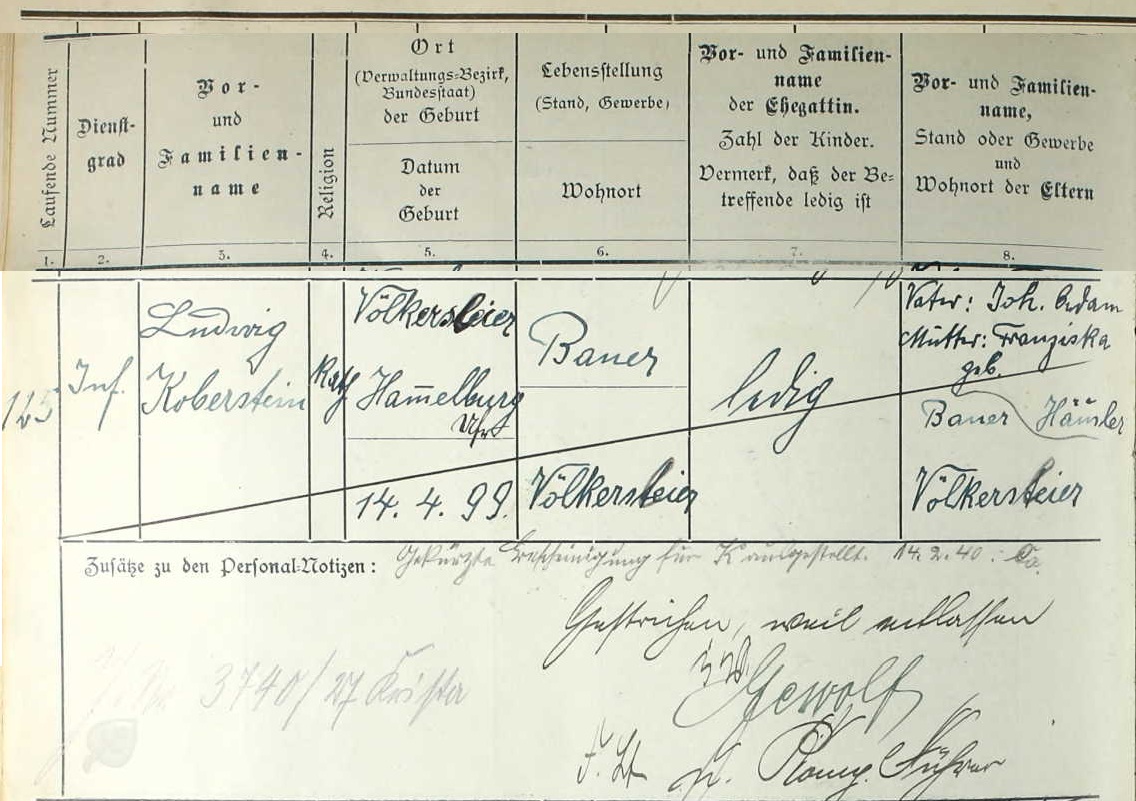 Birth Date: 14 Apr 1899 Birth Place: Völkersleier Hamelburg Combat Arm: Infanterie Type of Unit: Infanterie-Regimenter Unit: 8. bayer. Infanterie-Regiment Volume: 1015. Kriegstammrolle: Bd. 2