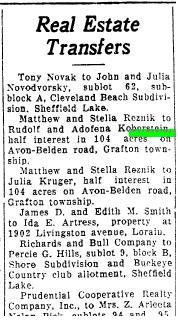 Matthew and Stella Reznik to Rudof and Adofena Koberstein half interest in 104 acres on Avon-Belden road, Grafton township.