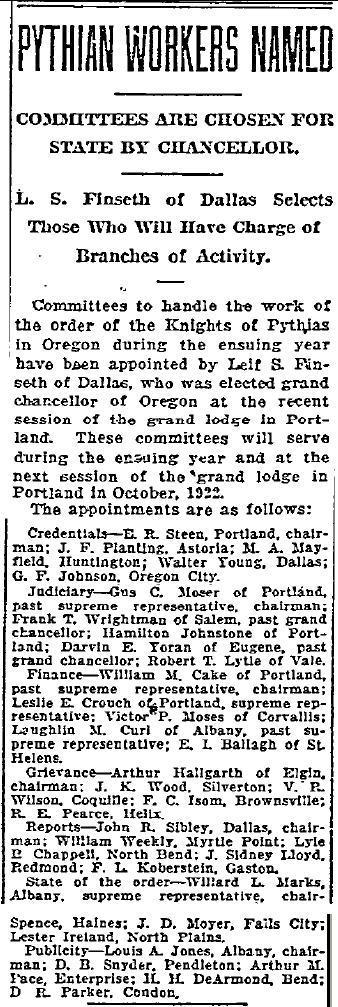 Wapato Lodge Elects (News Article), Date: 1922-01-13; Paper: Oregonian, Page 9