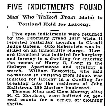 Five Indictments Found. Man Who Walked from Idaho to Portland Held for Larceny (News Article)
