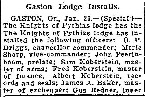 Gaston Lodge Installs (News Article), Date: 1922-01-22; Paper: Oregonian, Section1, Page 5