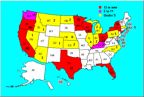 Arizona, California, Colorado, Flordia, Idaho, Illinois, Indiana, Kansas, Kentucky, Massachusetts, Michigan, Minnestota, Montana, Nebraska, Nevada, New York, North Dakota, North Carolina, Ohio, Oregon, Pennsylvania, Texas, Washington, Wisconsin