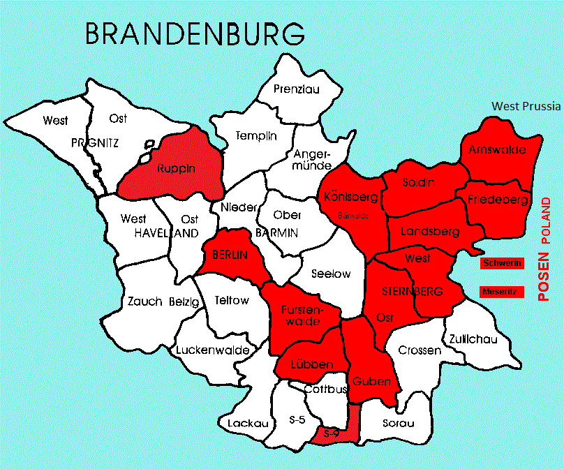 Section of Brandenberg with many Kobersteins. The counties (Kreis) with records for Kobersteins are in RED, click on these to go to the Genealogical data.