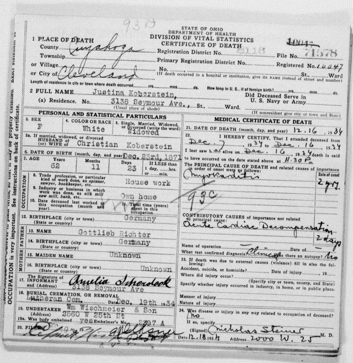 4Death Certificate, familysearch.org. "Justina Koberstein." Image.
