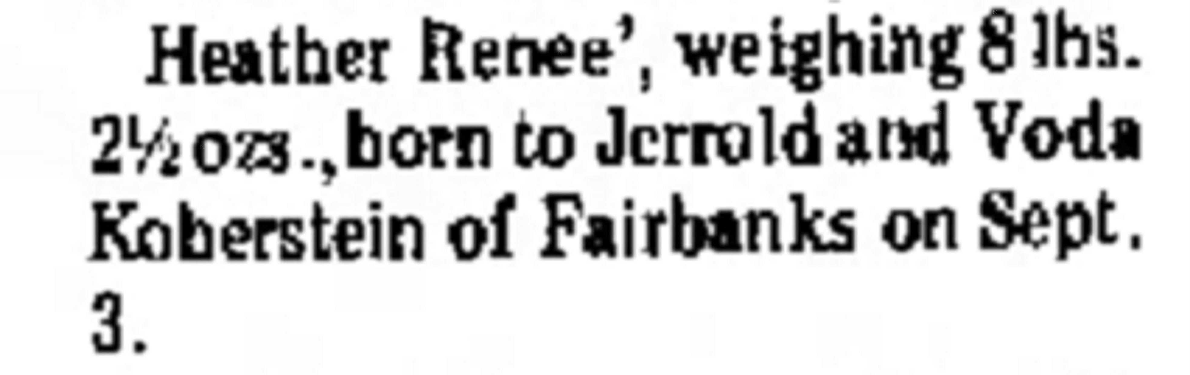 Heather Renee KOBERSTEIN was born on 3 Sep 1971 in Fairbanks, Alaska. |