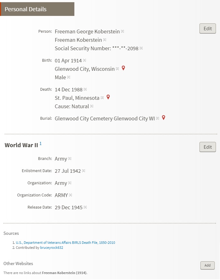 Freeman G. Koberstein born on 1 Apr 1914 in Wisconsin and deceased on 14 Dec 1988 while resident of St. Paul, Minnesota