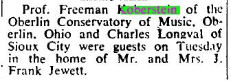 Prof. Freeman Koberstein of the Oberlin Conservatory of Music, Oberlin, Ohio and Charles Longval of Sioux City were guests on Tuesday in the home of Mr. And Mrs. J. Frank Jewett.