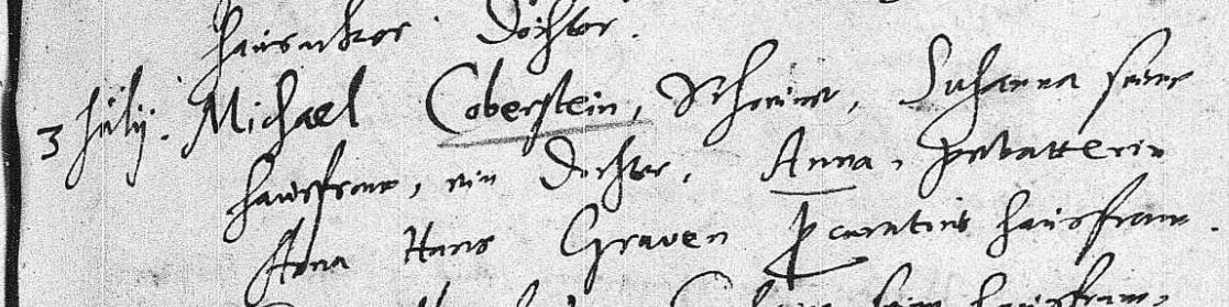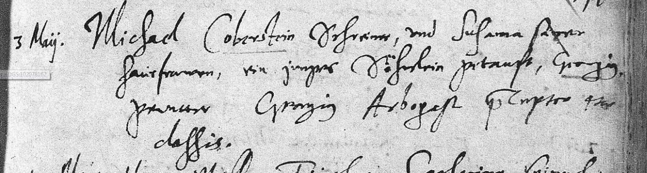 record title: Germany Births and Baptisms, 1558-1898 name: Georgius Coberstein gender: Male baptism/christening date: 03 May 1607 baptism/christening place: Barfüßer Klosterkirche, Heidelberg, Baden, Germany father's name: Michael Coberstein mother's name: Susanna indexing project (batch) number: C93414-1 system origin: Germany-EASy source film number: 1189251 Here is a clip of the original record: Kirchenbuch, 1592-1808 Film 1189251 item 7, DGS 102078162 Image 1059 of 1064record title: Germany Births and Baptisms, 1558-1898 name: Anna Coberstein gender: Female baptism/christening date: 03 Jul 1608 baptism/christening place: Heidelberg, Baden, Germany father's name: Michael Coberstein mother's name: Susanna indexing project (batch) number: C93414-2 system origin: Germany-EASy source film number: 1189252 Here is a clip of the original record.