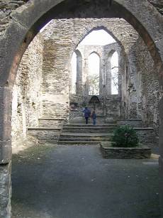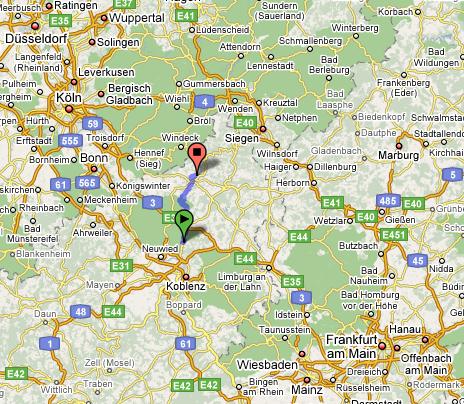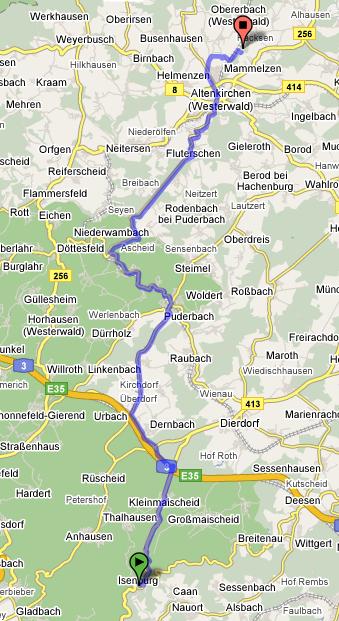 Chapel and ruins of the Isenburgs Chapel Hausenburg in Isenburg The Hausenborn reference is regarding a chapel dedicated to St. Mary and St. Servatius within the jurisdiction of the Bishops of Trier, that was built with money from the Lords of Isenburg, a very prominent german family. This was in 1441. However, in 1442 it says that "1442(11. Mai) verkauft Katharina von Koberstein den Baumeistern, Momparn (= Vertreter des Stifters/Inhabers) und Geschworenen der Kapelle Hausenborn, Philipp von Caan (Kane), Johann Kaillarde und Friedrich Klockner, Schöffe zu Isenburg, ihren Hof zu Oberengers mit allem Zubehör, für 350 schwere Oberländ. Gulden, zum Bau der Kapelle Unserer Lieben Frau zu Hausenborn" Which means that Katarina von Koberstein sold her house and belongings on Oberengers the 11th of May 1442 for 350 heavy golden coins, to the master Builder Philip von Caan, Johan Kaillarde and Friedrich Klockner, (the three of Them occupied in the hausenborn-isenburg project), "for the construction of The Chapel of our beloved Lady of Hausenborn". So I don't understand whether she sold the house and gave them the money Or perhaps gave the house with a given value of 350 to the gentlemen so that they would administrate the house/lands and invest the benefit in the construction. However the persona is well described, and she is indeed a noble lady if mentioned this way as a lady with powers to administrate her own house. The location is given in this text. At the local exit of Isenburg, toward Bendorf Sayn, not far of the point, where Iser and Saynbach unite, a steep path leads uphill on the right side. After a going time of approx.. 20 minutes meets one one in the forest church ruin lain in the middle. It concerns the former barrier travel chapel of "our beloved Lady of Hausenborn". The name Hausenborn is derived from "house at the fount". In direct proximity a source of water rises from the church ruin. (Note: these directions are coming from the south to the north towards Isenburg, also the Rhine river is just south of Bendorf) Here is a map from Isenburg to Obererbach, Koberstein Estate