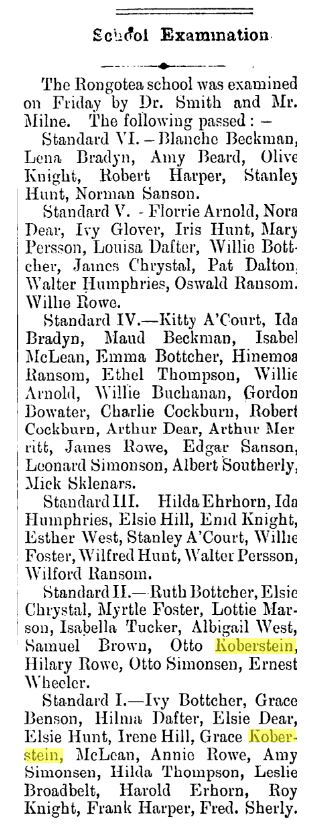 Mr. Frederick Willimam Koberstein, of Rongotea, died at his home yesterday, at the age of 94 years. Arriving in the district in 1876, he was one of the pioneers of the district, and literally carved his home out of the bush. He was a good citizen, and had the respect of all his neighbors. Of a strong constitution, he had never known what sickness was, and it was only three day before his death with old age telling its tale that he was confined to his bed, and he peacefully pssed away yesterday full of years an dhonours. He leaves a family of five sons and one daughter. The sons are: Augustus (Taikorea), William (Colyton), Amco (patea), Carl (Queensland), Fred (Wellington), and Watta (Shannon); and the daughter, Mrs C. Hartley (Wellington).