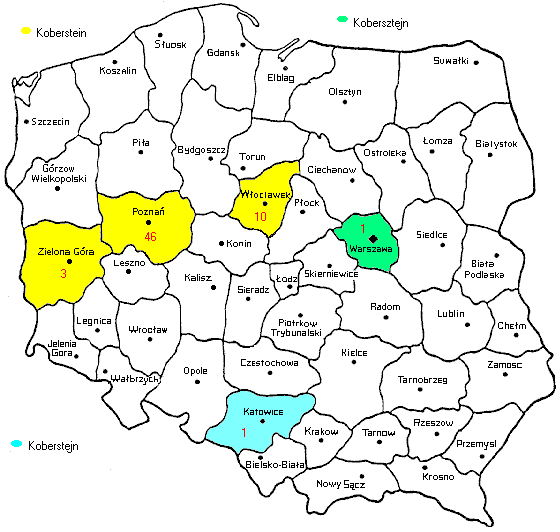 Here is a great web site to find current Koberstein, Koberstejn, or Kobersztejn locations * I have recently found out that there are Koberstein families still in Poland. The map below gives a distribution of these directory listings by pre 1999 province. On January 1, 1999 these provinces were consolidated. The distribution of Koberstein families largely follows the early distribution, however none were found in Pita or Gorzow Wielkopolski. Both of these areas had Koberstein families in the 1800's. The person who looked this up for me said, "I was surprised to see there is a listing -- so many ethnic Germans fled from Poland after World War II that we ususally don't find many names that are obviously German in origin. German names that were common in Poland before 1939 now show up with tiny numbers, or don't show up at all, so I halfway expected there'd be no Kobersteins." William F. Hoffman, Author, "Polish Surnames: Origins & Meanings" |
