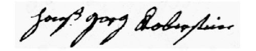 The Jacob is clear enough. The last name starts with a clear 'K', then an 'o'. the next letter is out of place if Koberstien is the correct signature. It will take more research, including a proper copy of the record to discover what it may be. Next is a 'b', but oddly the upstroke is crossed. Then there is a typical German script lower case 'e'. The German Script 'e' looks more like an 'n'. See the attached old German Script alphabet for comparison. Then comes an 'r'. This 'r' looks more like the regular english 'r' than a german script 'r' which is more like an english 'v'. However, I have seen cases of mixed english and german script letters. Next comes a German script 's' which is more like an english lower case cursive 'f'. It is followed by a clear crossed 't'. The upper loop on the german script 's' is compromised by the need to cross over to the downstoke of the 't'. Also the cross stroke of the 't' may have been made large and it skipped making the cross stroke on the up stroke of the 'b'. Next there is a clear german script 'e', which looks more like a english 'n'. Next we find a clear 'i', with a clean dot above the 'i'. Last there is a clear 'n'.