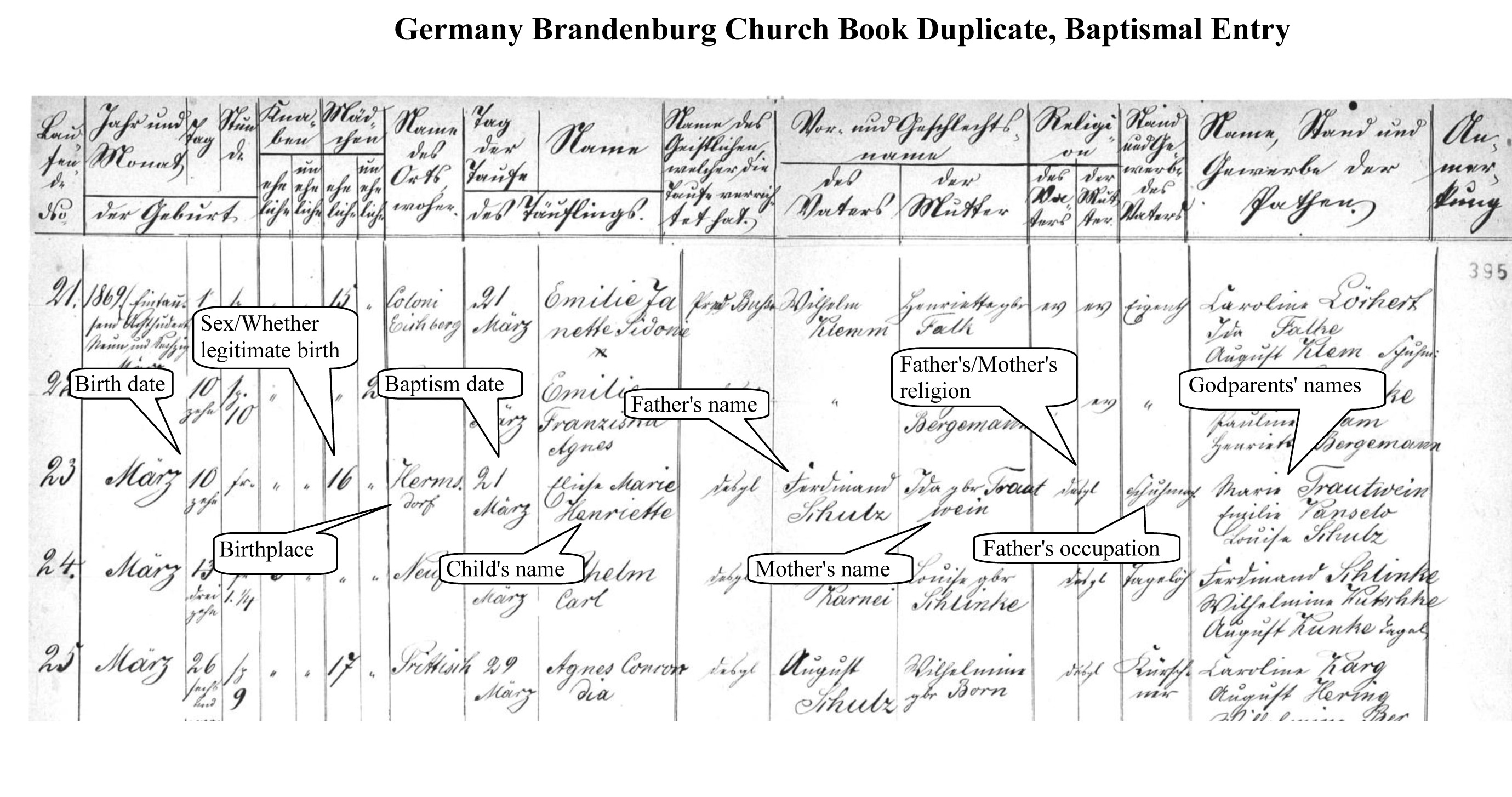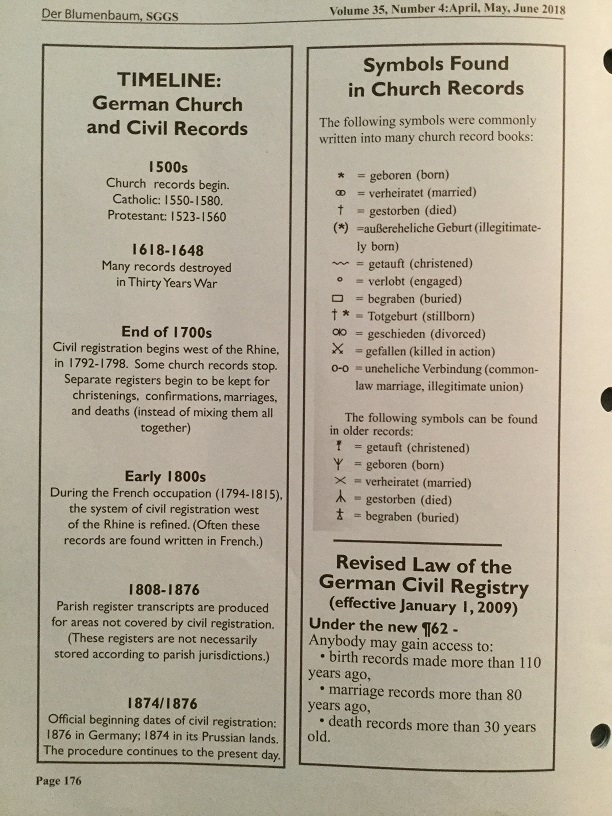 * geboren born (*) aussereheliche Geburt born illegitimate ~ getauft baptized ~~ getauft baptized o verlobt engaged oo verheiratet married I oo 1e verheiratet 1st marriage II oo 2e verheiratet 2nd marriage + gestorben died +us mortuus died +g mortuus died +* Totgeburt stillborn o/o geschieden divorced o|o geschieden divorced o-o freie Verbindung illegimate or common law union X gefallen killed in war +X an im Kampf erlittenen Wunden gestorben died of wounds in war [] begraben buried ++ diese Linie ausgestorben this line extinct !! Pfarrer Reverend /### Kind von ### child of parent ### |