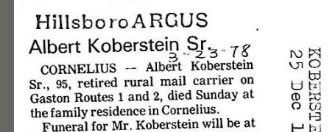| June 17, 2015 | Cecil L. Koberstein Jr., of North Bend, was born April 13, 1932 in Gaston, Ore. and passed away peacefully June 1, 2015, at his home. | |