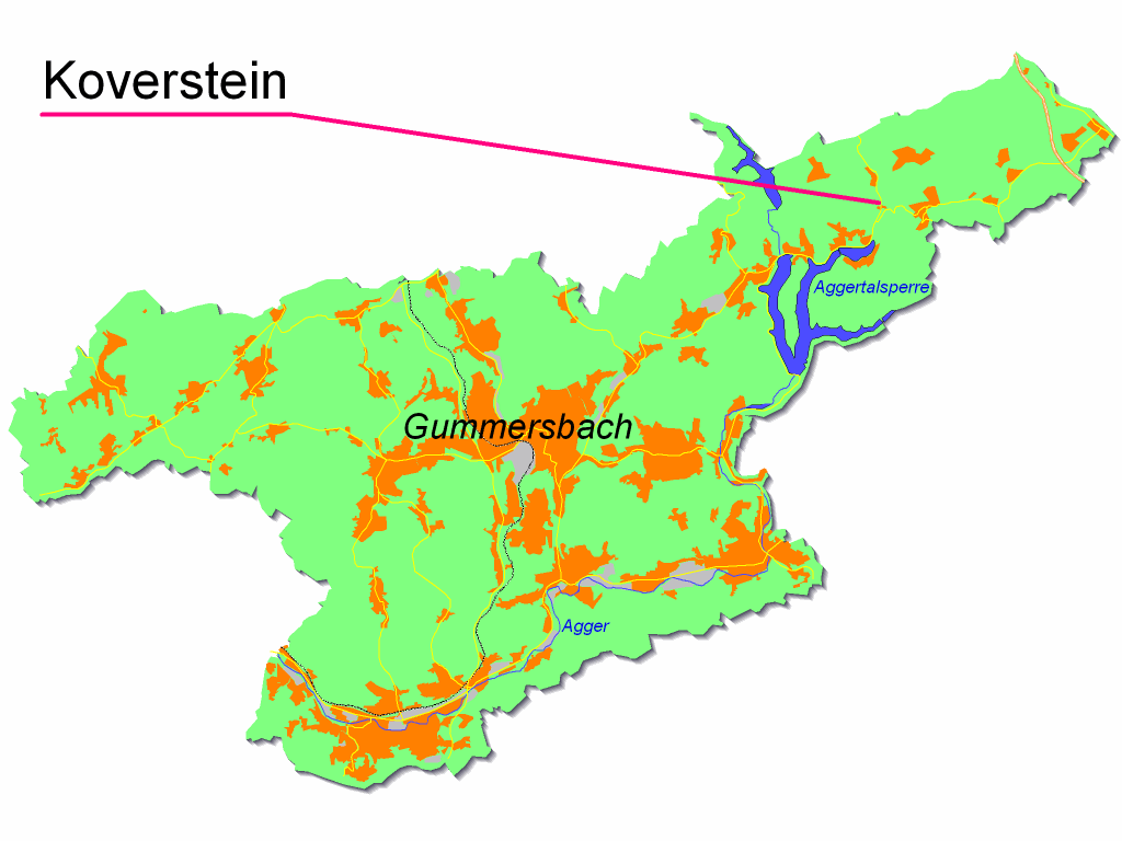Koverstein was a noble seat in the Märkisches Amt Neustadt, the later imperial rule Gimborn - Neustadt. It is not very far from Lieberhausen and is now in the urban area of Gummersbach. According to Dittmaier, the name appears in documents as early as 1342. Johann von Coverstein was officially granted a right castle loan in the parish of Lieberhausen on April 3, 1413 by the Counts Adolph von Cleve and von der Mark.