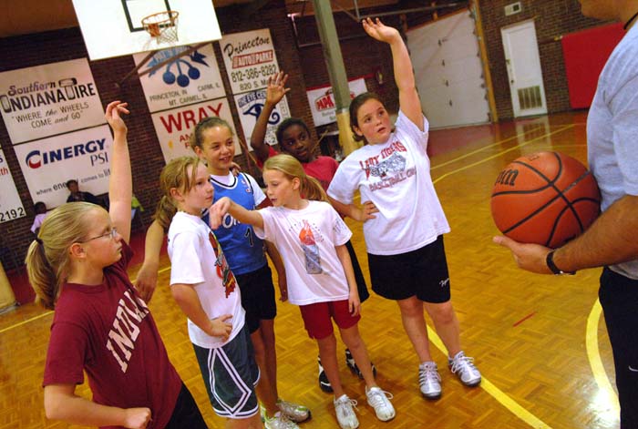 Coach Jay Thompson offers his girls a quick talk on how to shoot the basketball properly, to make sure they know to follow through with their shots. The girls are, from left, Alyssa Koberstein, 9, Rylee Page, 9, Brooke Walden, 10, Meghan Bock, 10, Jackie Young, 9 and Raelynn Thompson, 10. (Evansville IN Courier Press from November 6, 2006)