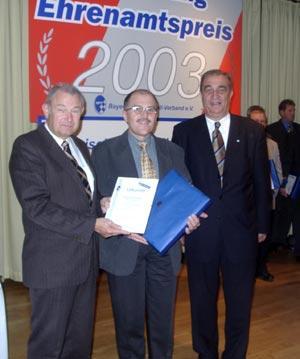 Aus diesem Grund wurde ihm, gemeinsam mit weiteren 28 bayerischen Kreissiegern, am 15.11.2003 im Hotel Residenz in Bad Windsheim der BFV Ehrenamtspreis 2003 verliehen. Die feierliche Veranstaltung des Bayerischen Fußballverbandes im Windsheimer Hotel Residenz stand unter dem Motto "Ehre wem Ehre gebührt". Als Festredner fungierte Bayerns Innenminister Günther Beckstein. Auch wenn Horst Koberstein am Siegerpodest nur ganz knapp vorbeischrammte, ist es doch ein großartiger Erfolg und eine Würdigung seines langjährigen ehrenamtlichen Engagements. Mit ihm freuen sich natürlich die Vorstandschaft und die Mitglieder des VfL Treuchtlingen, zu deren Wohl sich Horst Koberstein seit 1996 engagiert. |