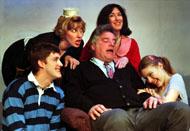 Oregon Daily Emerald, November 24, 2003 The Oregon Daily Emerald is located in Erb Memorial Union, 1222 East 13th Avenue, Eugene Oregon 97403 New Voices showcases student one-act plays The annual production features three original student-written plays by Steven Neuman, Freelance Reporter, November 21, 2003 Seeing a play at the University Theatre's Pocket Playhouse is sort of like digging through bins at a thrift store. A measly few dollars can unearth either a gem of delight or a total disaster. New Voices, an annual theater production comprised of student's original one-act plays, displays the full spectrum of student-playwright potential -- the good, the bad, and the sublime. All three productions utilize the same seven performers in different roles. While they sometimes fail in one piece, on the whole, they eventually prove themselves as excellent talents in at least one of the others. The first play, "Need" by L. Maxmillian McCall, is by far the weakest entrant of the bunch. It centers around the ambiguous relationship between roommates Cole, (played smartly by Andrew Hill, and Michelle (in a weaker performance by Margie Kment. McCall's writing thrusts the audience into a vaguely apocalyptic world where the two experience a sense of sexual urgency that forces the characters to take their relationship to the next obvious step. The two spend the remainder of the play prodding insecurities while circling each other emotionally like boxers in the ring. Kment does an admirable job but her anger feels forced and her movements feel overtly staged. Furthermore, the sexual tensions brought on by disaster come across as intensely cliché. "Between the Lines" by Dinae E. Horne rings truer. It explores the notion that the most interesting aspect of passing conversation is not what is said, but what is thought. Although the play is focused around the chance meeting of two nameless college students, the comic timing of their respective alter-egos, played by Teresa Koberstein and Eric Dodson is where the characters really interact. Both sound off on their neurotic foibles and bring sparkle to what could easily be an intriguing or otherwise dry, dramatic experience. The third play, "Talking to Strangers," by Matt Chorpenning is a real treat. If Woody Allen was in college today, he would be writing material like this. The piece scrutinizes the intense process of asking a stranger out on a date, or as a stumbling "Mark" and "Emily" deem it -- "a conversation." The two become familiar with each other through hilariously awkward silences. Koberstein and Dodson exude real chemistry as the pair of reluctant lovers, and Chorpenning's self-effacing dialogue (one quickly gets the sense that "Mark" is a thinly veiled version of the author) is a perfect fit for the two. Natalie Jansson and Michael Koopman turn in a sharp renditions of the cynical best friends, and their timing meshes beautifully with the overall light-hearted tone. Kment redeems herself from "Need" as the brilliantly obnoxious barista that will be eerily familiar to any cafe patron. New Voices runs tonight and Saturday night, starting at 5 p.m. There is no late seating. Tickets are $3 at the door at the Pocket Playhouse, located 102 Villard Hall. Second Photo: March 21, 2004, Humanity gets by - by `The Skin of Our Teeth' By Fred Crafts, The Register-Guard, Portland Oregon: Appearing in Lord Leebrick's staging of "The Skin of Our Teeth" are (from left): Johnny Ormsbee, Victoria Blake, Ken Hof, Ariel Pearlson and Teresa Koberstein.