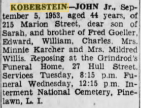 John KOBERSTEIN Jr. was born on 25 Oct 1908 in New York, United States. He died on 5 Sep 1953. He was buried in 1953 in East Farmingdale, Suffolk, New York, United States of America.[Notes] 26 F iv
