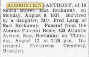 10. Anthony KOBERSTEIN (Andrew , Anthony ) was born in Apr 1869 in New York, United States. He died on 9 Aug 1937 in Hempstead, Nassau, New York, United States. |