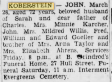 13. John KOBERSTEIN (Andrew , Anthony ) was born on 17 Oct 1878 in Brooklyn, Kings, New York, United States. He died on 22 Mar 1951 in Brooklyn, New York City, New York, United States. |