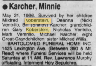 24. Minnie KOBERSTEIN (John , Andrew , Anthony ) was born on 30 Jun 1907 in New York. She died on 21 May 1996 in Rochester, Monroe, New York. |