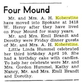 The April 15, 1955 newspaper column indicates the A. H. Koberstine family moved to Spokane at 3418 W. Heroy. They had lived "on Four Mound for many years". Apparently Mr. and Mrs. Emil Brandt and Dorothy were dinner guests at this new location.