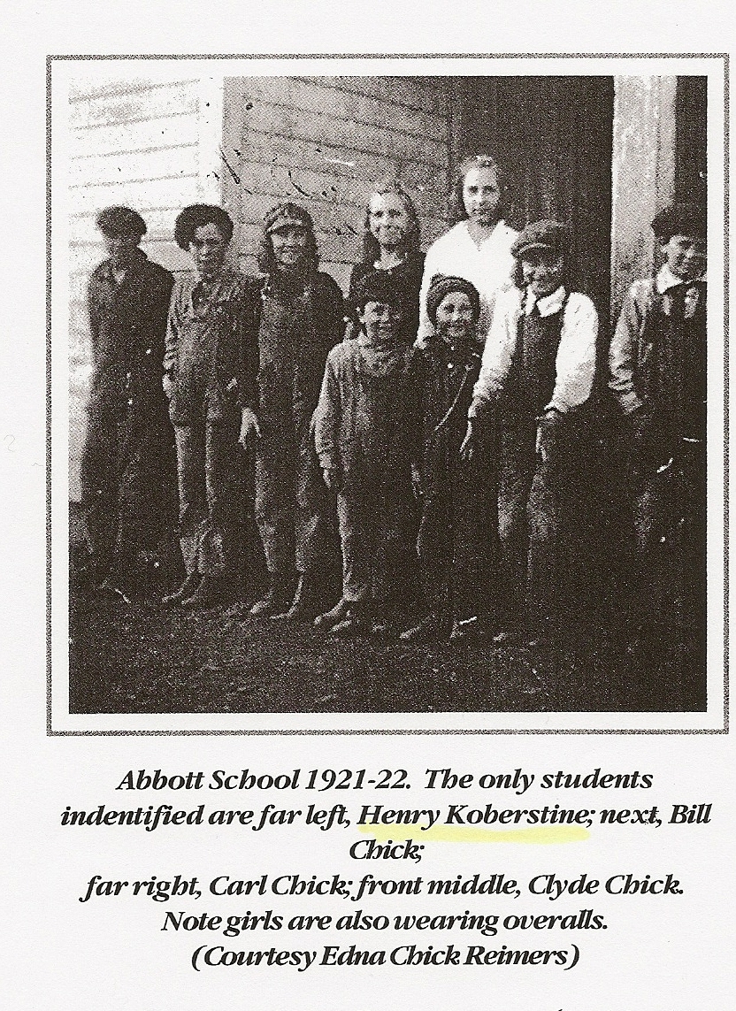 page 97/98 - Abbot School District #134 was created on July 29, 1898. The schoolhouse was located on Charles Road oat the bottom of Turfey Grade on property purchased from Lewis and Grace Ebbert for $1.00 in gold coin on March 29 of that year. The District covered what had been the northern portion of the Four Mound School District lying sourth and north of Charles and South Bank Roads, and a piece of the Central School Dsitrict located due east of Knight's Lake. In 1903 a northern section of the Warsaw District was added. ... Enrollment hovered around fifteen the years it was in existance. The three oldest Chick children, Bill, Carl and Clyde, attended the Abbott School along with Hank, Dora, Martin and Mary Koberstine, ...