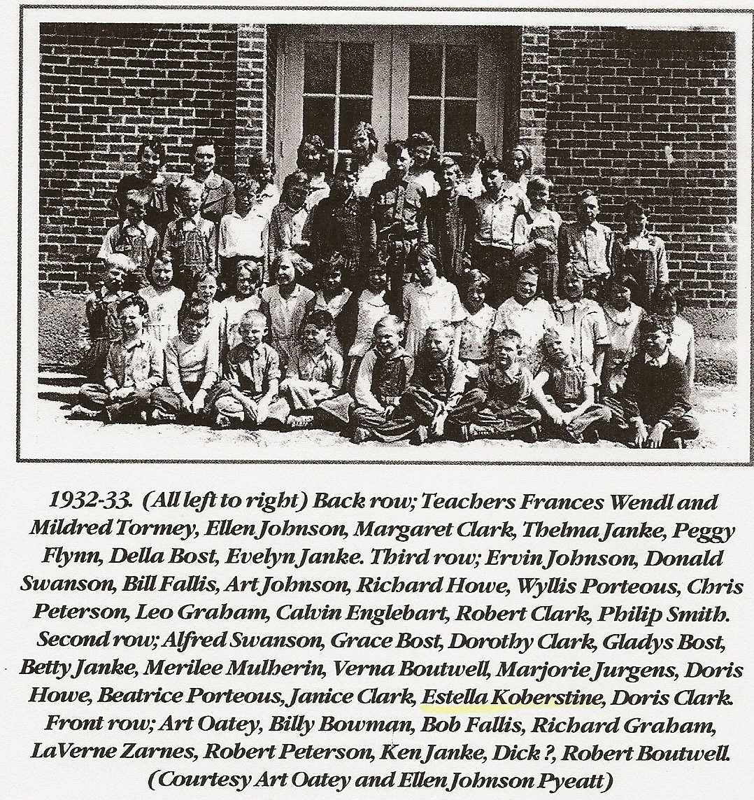 page 90/91 - While they lived up on Four Mound Prairie, the lives of many of the earliest settlers there intertwined with those down along the river. The Frazer, Koberstine and Collins families were very early homesteaders and their children went to Pine Park and later Nine Mile Falls Schools. John Frazer, August Koberstine and Ed Collins were stalwarts of the township from its beginning. Walt Collins followed in his fathers footsteps in the township. Mr. Koberstine was also active in the Community Club after its formation