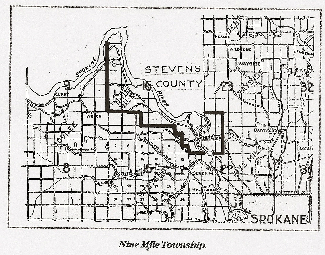 page 148 - Those holding township office for a number of years in the early days represented a whide area of the township. Edward F. W. Geiselman lived adjoining the Knights Lake property; Henry Rose on Four Mound; John Frazer, Walt Collins, and A. H. Koberstine up Turfey Grade; John Chick, C. E. Engstron, and Charles Jundberg along Charles Road; Joe and Bob McBride between the river and South Bank Road; John Nordmark from the power plant; Charles Granger along the river; John Gorman on the flat above the little Spokane River by the county line; James Tripp on the Little Spokane; and Ed Tormey and Louis B. Nygren in the immediate Nine Mile Falls area.