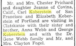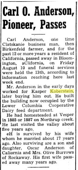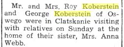 Biography of Carl (Karl), George, Roy and Kasper Koberstein as reveled in the Clatskanie Journal newspaper covering the time 1950-1953.