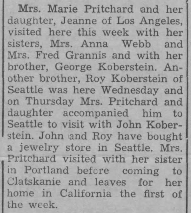| The Clatskanie Chief dated June 9, 1950 lists Mrs. Marie Pritchard and daughter Jeanne visiting from Los Angeles with family. | ![]() |