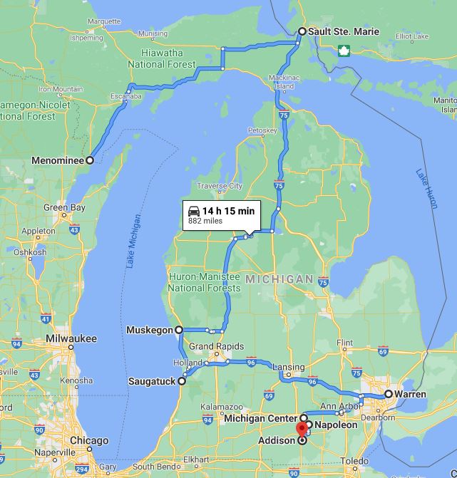 Menominee, Sault Ste. Marie, Muskegon, Saugatuck, Warren, Michigan Center, Napoleon and Addison.