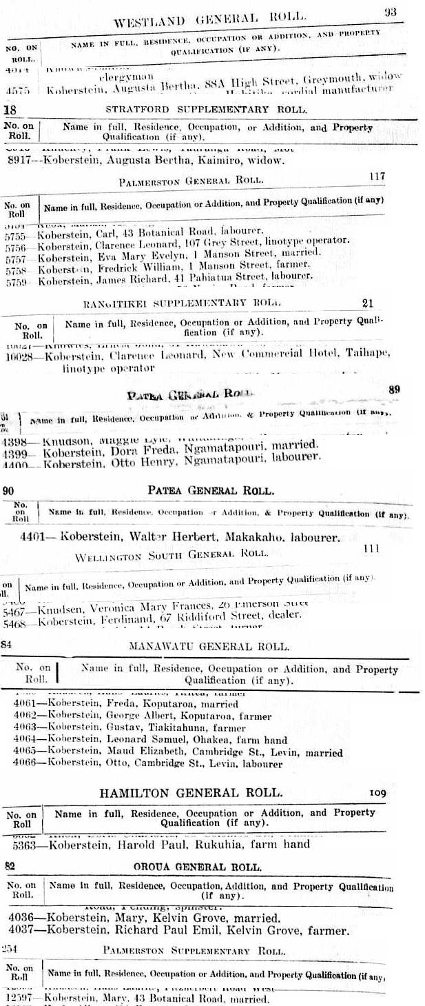 All New Zealand, Electoral Rolls, 1928 results for Koberstein