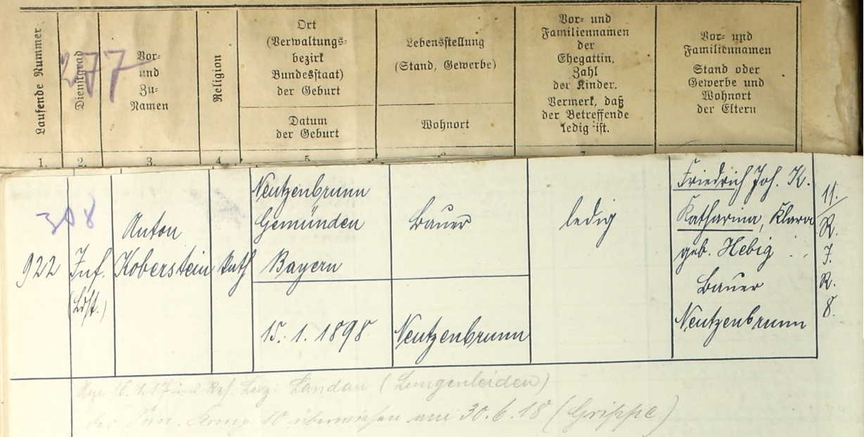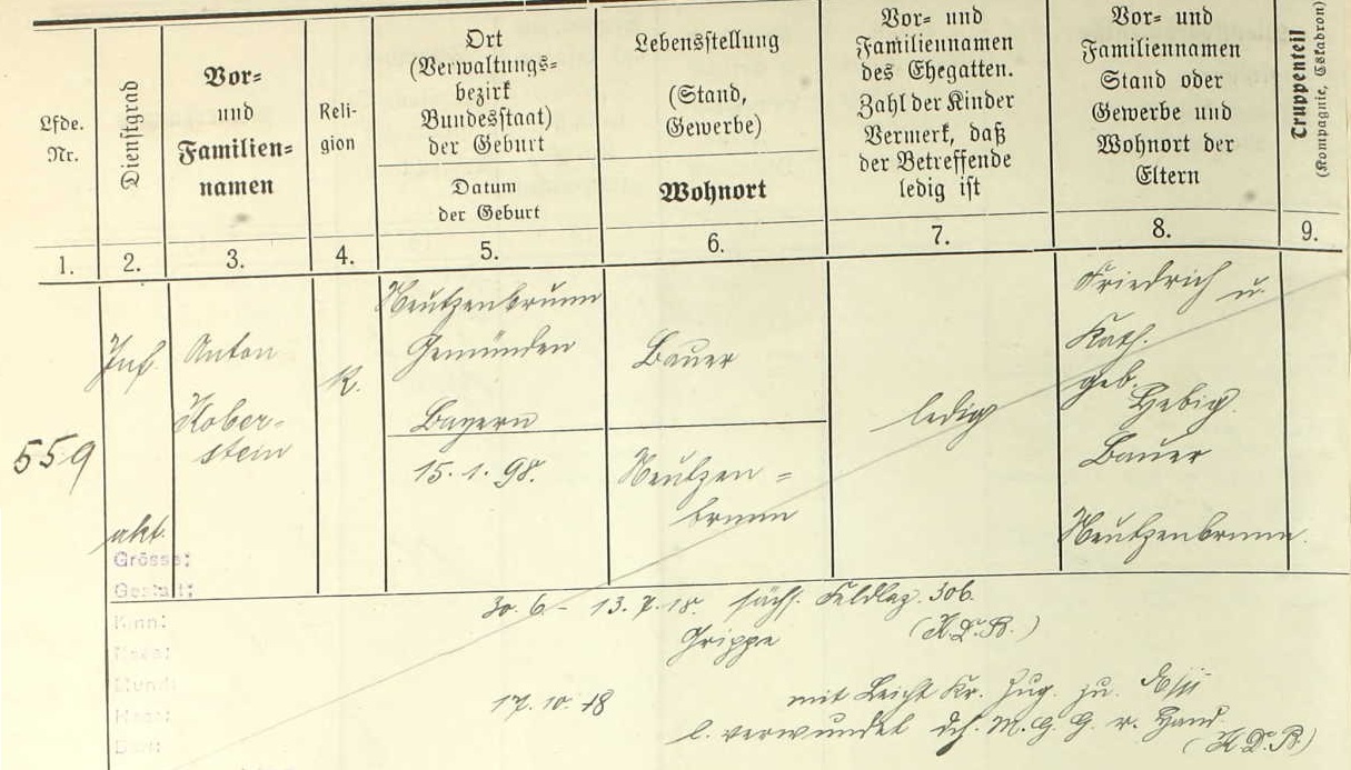 Name: Anton Koberstein Birth Date: 15 Jan 1898 Birth Place: Neutzenbrunn Gemünden Bayern (Bavaria) Combat Arm: Infanterie Type of Unit: Infanterie-Regimenter Unit: 32. bayer. Infanterie-Regiment Volume: 2326. Kriegstammrolle: Bd. 2