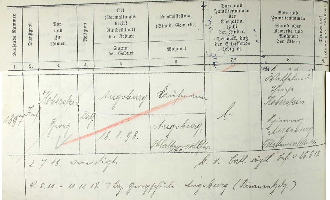 Name: Franz Koberstein Birth Date: 18 Jan 1898 Birth Place: Augsburg Combat Arm: Infanterie Type of Unit: Infanterie-Regimenter Unit: 3. bayer. Infanterie-Regiment Volume: 609. Gesamt-Renner: 1. - 4. Kompanie und 1. Masch.-G.-Komp.