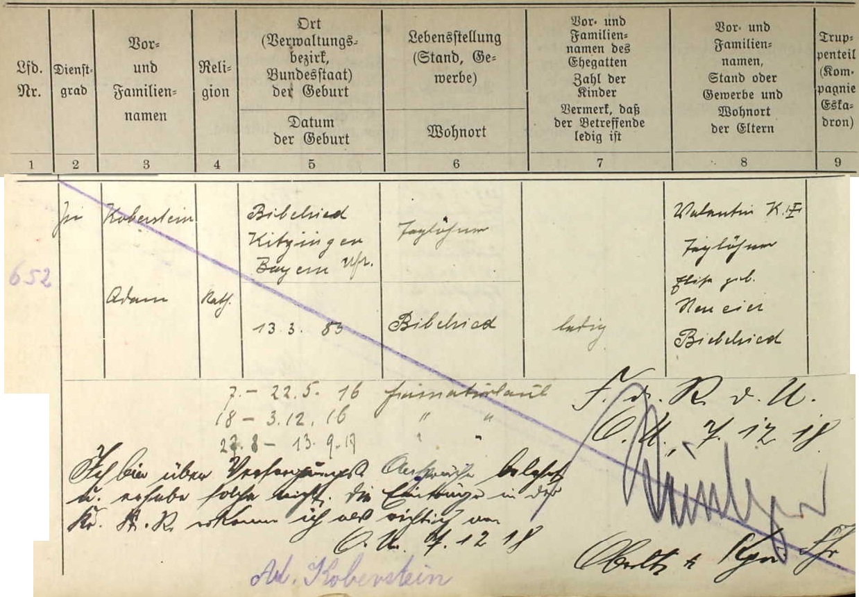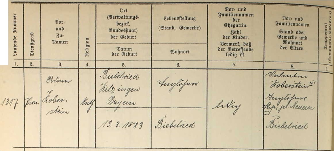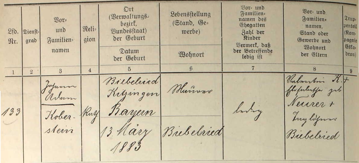 Name: Adam Koberstein Birth Date: 13 Mrz 1883 (13 Mar 1883) Birth Place: Bibelried Kitzingen Ufr Bayern (Bavaria) Combat Arm: Pioniere Type of Unit: Pionier-Formationen: Reserve-Pionier-Kompanien Unit: bayer. Pionier-Kompanie 8 Volume: 16228. Kriegsstammrolle: Bd. 2